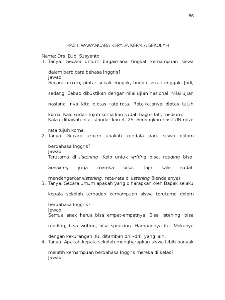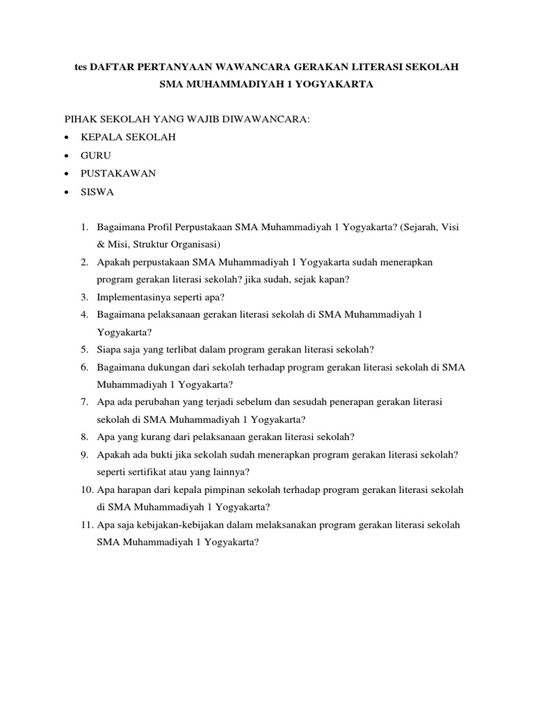 Instrumen Observasi Wawancara Sekolah Luar Biasa from image.slidesharecdn.com Apa yang ibu/bapak lakukan apabila sekolah kita ini mendapatkan seorang guru yang korupsi? Adakah informasi mengenai program sekolah? Lembaga pengembangan dan pemberdayaan kepala sekolah badan pengembangan sumber daya manusia. Apakah semua penerimaan dan pengeluaran yang berkaitan. Guru olah di sekolah anak kita pintar memijat, ngerti urat lagi katanya. Bagaimana mekanisme pencairan dana bos untuk pembiayaan kegiatan sekolah? Diketahui, para guru diharuskan menjawab dengan pilihan antara sangat tidak setuju, tidak setuju, cenderung setuju, dan sangat setuju. Sekolah diseleksi dari kepala sekolah yang mendaftar dan lulus seleksi.